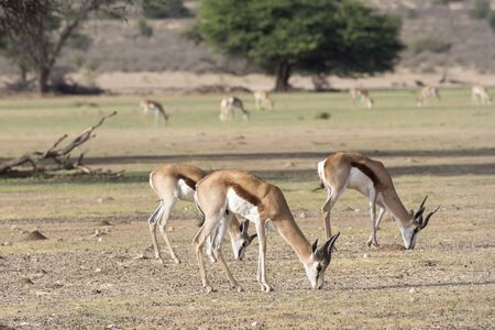 Springbok or Springbuck (Antidorcas marsupialis) grazing at dawn, Auob River, Kgalagadi Transfrontier Park, Kalahari, Northern Cape, South Africa