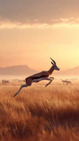 timeless gazelle photographed in a leaping pose in a grassy expanse, in a classic wildlife photography style, with sunlit tones, golden hour light, high resolution