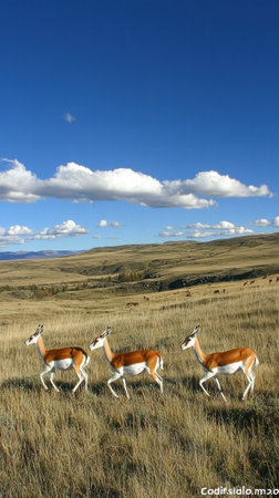 A serene image of three antelopes gracefully walking across a vast green landscape under a clear blue sky. The tranquility of nature shines in this captivating scene.