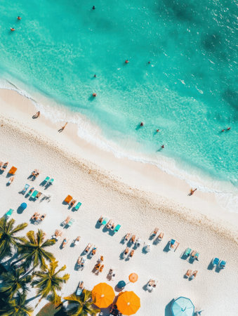 Visitors enjoy a sunny day on the beach in Miami, lounging under colorful umbrellas while others swim in the refreshing turquoise waves.