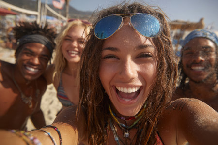 Cheerful young woman in sunglasses taking selfie with friends on beach
