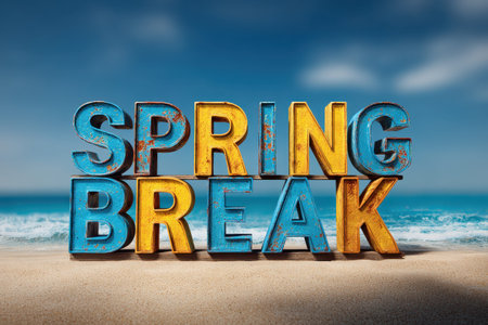Colorful spring break sign at the beach captures the lively spirit of vacationers enjoying sunny days by the ocean with vibrant letters representing fun and celebration