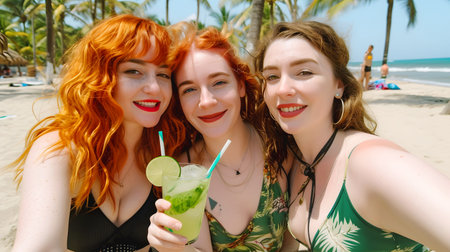 Three friends enjoying a sunny beach day with smiles and laughter in vibrant swimsuits during a warm summer afternoon. Generative AI
