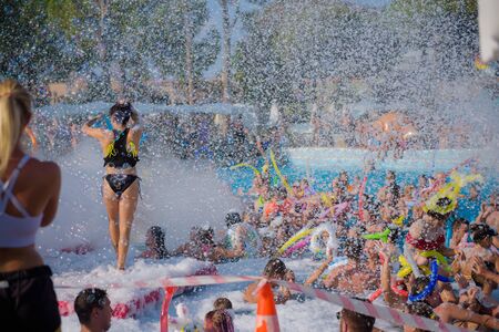 ANTALYA TURKEY 27 SEPT 2019: Party in the pool with foam and show program. Dancing in the summer in the hotel’s refreshing pool, lots of people have fun and dance