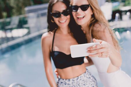 Selective focus of happy blonde and brunette women in sunglasses and swimsuits taking selfie near swimming pool