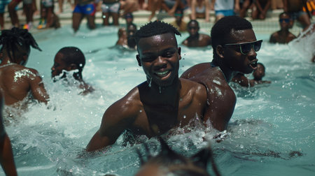 Young friends bond over drinks and laughter at a lively pool party in a bright setting.