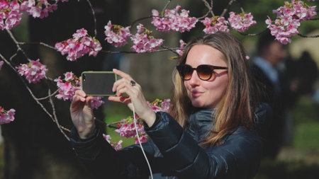 Woman tourist relaxes in Tokyo park, making selfie with Sakura flowers. Happy beautiful Caucasian girl takes a photo on a smartphone, enjoy spring natural landscape. Travel, tourism, holiday in Japan