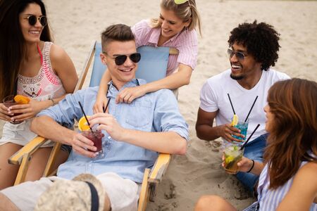 Group of friends having fun on the beach. Summer holidays, vacation and people concept.