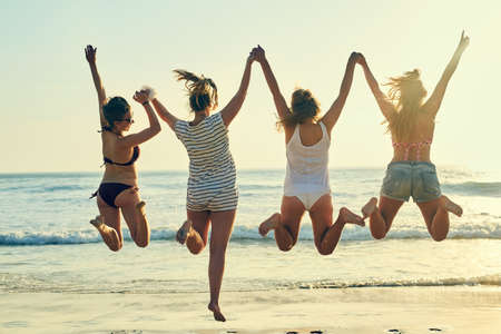 Beach days are the best days. Rearview shot of female best friends jumping in the air at the beach.