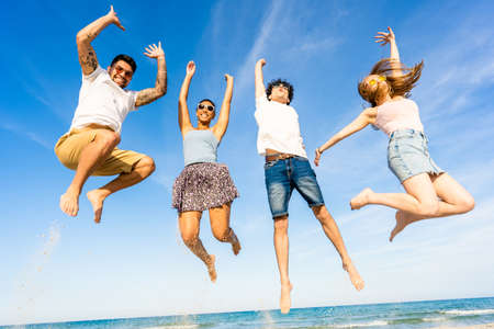 Energetic, happy young people living their best life on the beach. Full of laughter and vitality