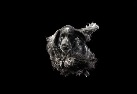 A cute and adorable young blonde cocker spaniel puppy running and jumping up in mid air on a black background isolated with a surprised and excited look on its face and looks like it is flying