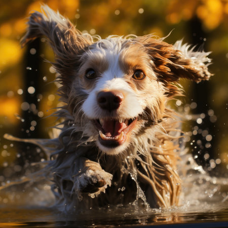 A close-up of a wet dog's face as it bites at splashing water, its playful energy on full display
