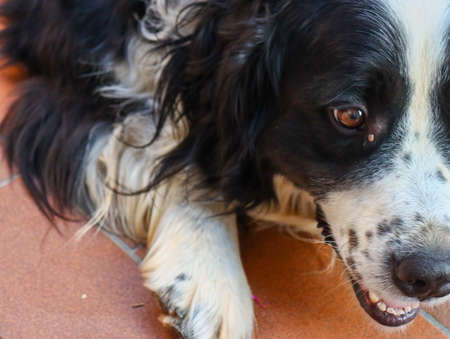 Spaniel puppy dog portrait image. Close-up of a cute spaniel face in profile. Beautiful handsome Sprocker spaniel. Young cross Cocker and Springer spaniel dog. White and brown liver spot spaniel head.