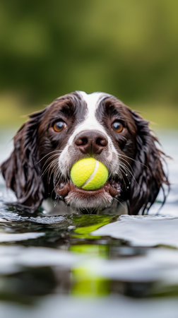 A happy springer spaniel swims energetically in a serene pond, proudly holding a bright tennis ball in its mouth under clear blue skies.