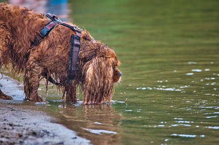 Dog Nova Scotia Duck Tolling Retriever walking in summer, standing in water