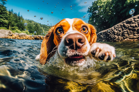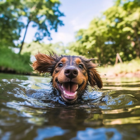 An AI generated illustration of a brown puppy swimming joyfully in a tranquil lake