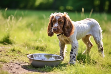 Young english cocker spaniel dog sitting in green grass at summer nature