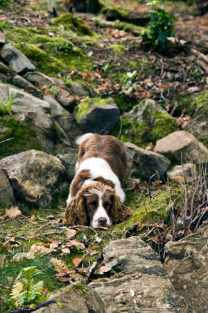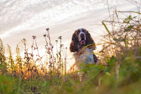 The gun dog sits in the wild grass autumn field. Young hunting dog in the autumn forest. English springer spaniel breeds