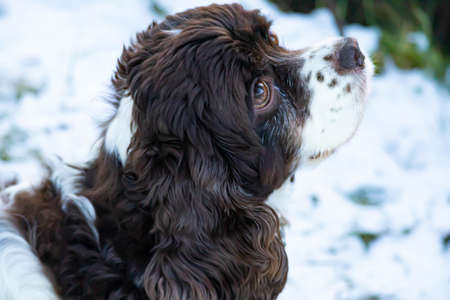 Springer and cocker spaniel dog muzzle close-up portrait. Long ears in a hunting dog. White snow in the background
