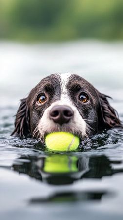 A cheerful springer spaniel swims through a tranquil pond, proudly holding a bright tennis ball in its mouth, enjoying a sunny day outdoors.