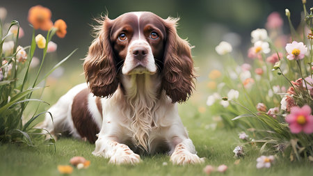 Cute English Springer Spaniel puppy sitting in the grass with flowers