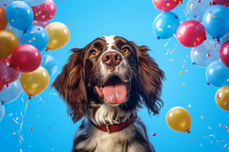 Generative AI. birthday concept. A brown and white spaniel on a blue background among colorful balloons, front view. A minimalistic greeting card with dog.