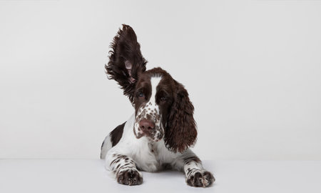 Portrait of purebred english springer spaniel dog calmly lying with ear flying upwards isolated over grey background. Concept of motion, domestic pets, animal life. Copy space for ad