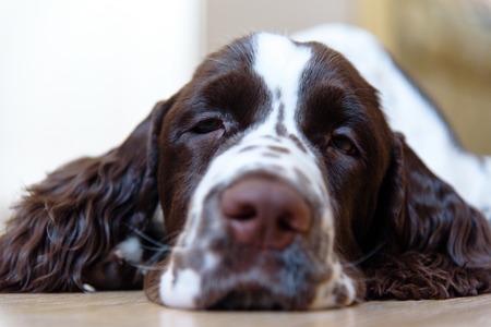 Sad Dog breed English Springer Spaniel is lying down on the floor and waiting for his family, the owner home. A sad pet is alone at home, lying and waiting for the return of his friends. Stay at home.