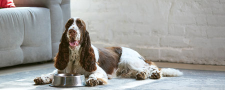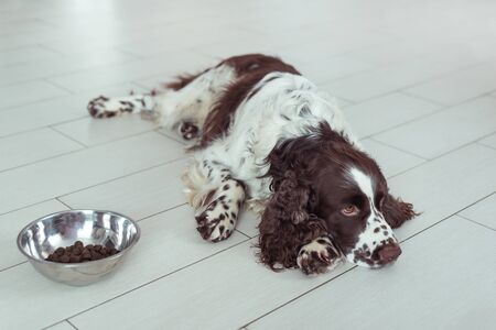 English Springer Spaniel is lying down on the floor next to a bowl of dry dog food. A sad pet is waiting for permission to start eating.