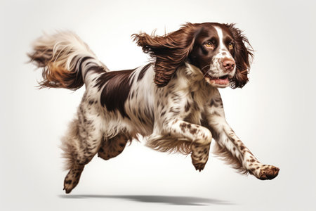 Jumping Moment, English Springer Spaniel Dog On White Background.
