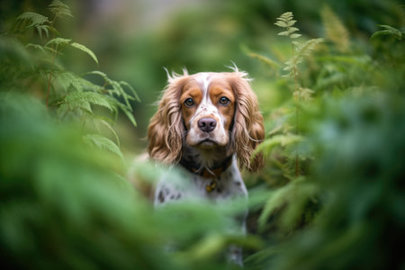 spaniel with fur in lush greenery