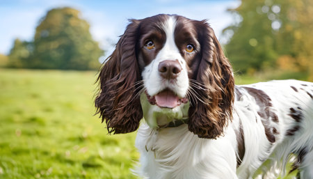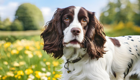 Cute English Springer Spaniel dog sitting in a meadow on a sunny day