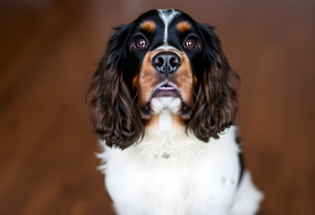 Cute English Springer Spaniel dog sitting on the floor at home
