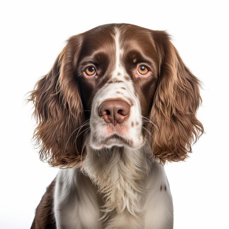 the springer spaniel, a friendly and energetic breed, poses against a crisp white background, showcasing its beautiful liver and white coat, floppy ears, and expressive brown eyes, highlighting its gentle and playful nature, perfect for families and outdoor enthusiasts. ai generated