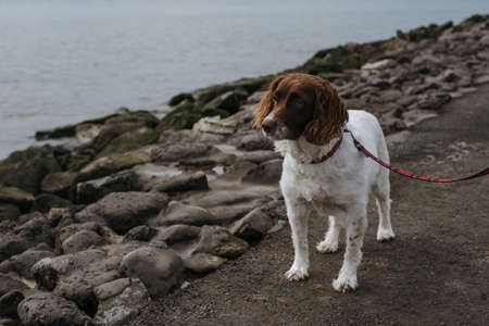 A beautiful shot of a white and brown dog with a red leash around his neck near a shore