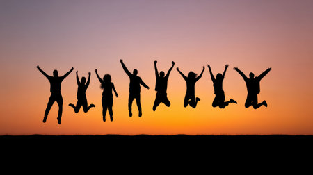 A dynamic group of friends jumps joyfully against a stunning sunset backdrop, celebrating life, freedom, and friendship in a spirited outdoor moment.