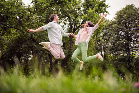 Photo of shiny carefree couple wear casual clothes smiling holding arms jumping high outdoors urban city park
