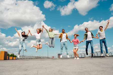 Group of young people have fun jumping in the air for joie de vivre and lightness