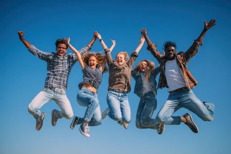 Group of young multiracial friends jumping joyfully against a bright blue sky while enjoying a day outdoors in a park filled with sunshine and laughter