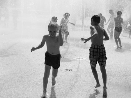 July 15, 2020. Izhevsk, Russia. Happy children playing in water fountains summer