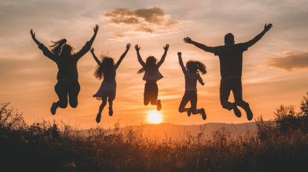 A captivating scene of a family jumping joyfully against a stunning sunset backdrop, embodying happiness and the spirit of togetherness in a natural outdoor setting.