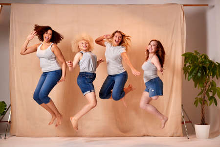 Group Of Diverse Body Positive Casually Dressed Women Friends One With Prosthetic Limb Jumping