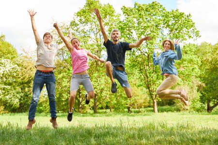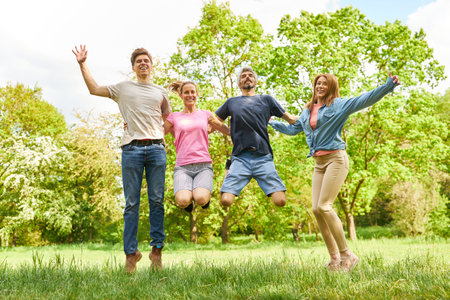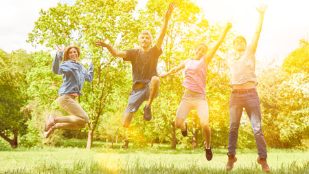 Active group of friends jumping in nature as exercise