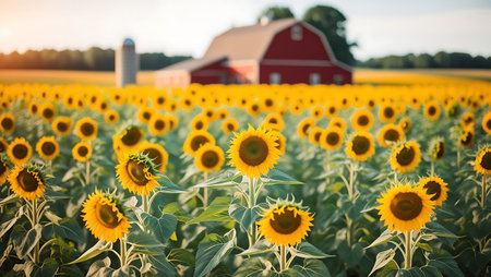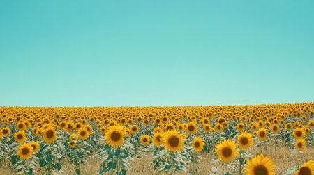 Side view of a sunflower field stretching into the distance, with a clear blue sky offering ample space for text or product information.