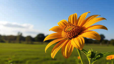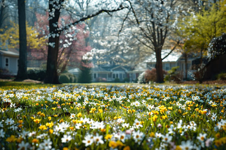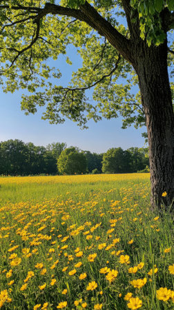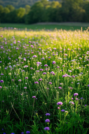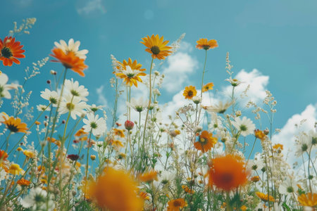 Scenic landscape with vibrant wildflowers in a sunny field, showcasing the beauty of nature and tranquility, ideal for spring and summer themes