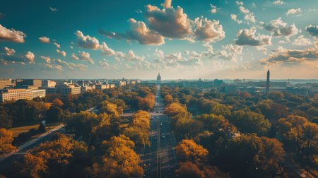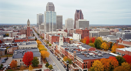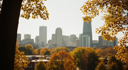 Aerial View of Modern City Skyline With Colorful Autumn Trees