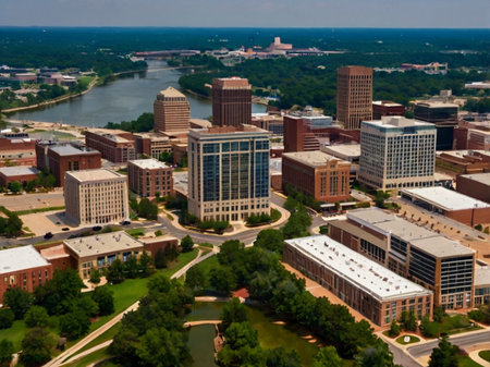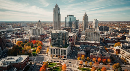 Aerial view of downtown Charlotte, North Carolina during fall season.