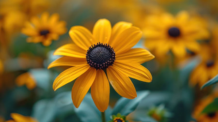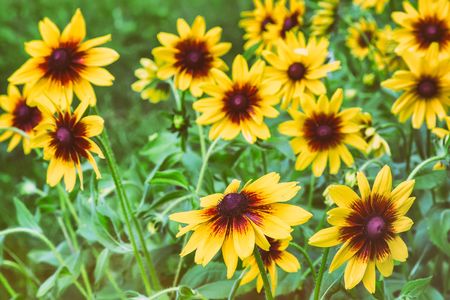 Rudbeckia plants, the Asteraceae yellow and brown flowers, common names of coneflowers and black eyed susans. Positive and happy feeling in spring given by flowers