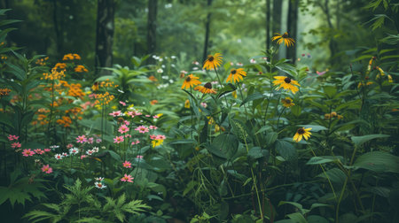 Vibrant wildflowers blooming amidst the dense foliage of a lush green forest.