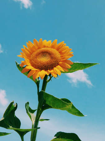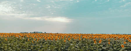 Beautiful summer landscape with blooming sunflowers against blue sky. Agricultural rural background, nature summer landscape, close up